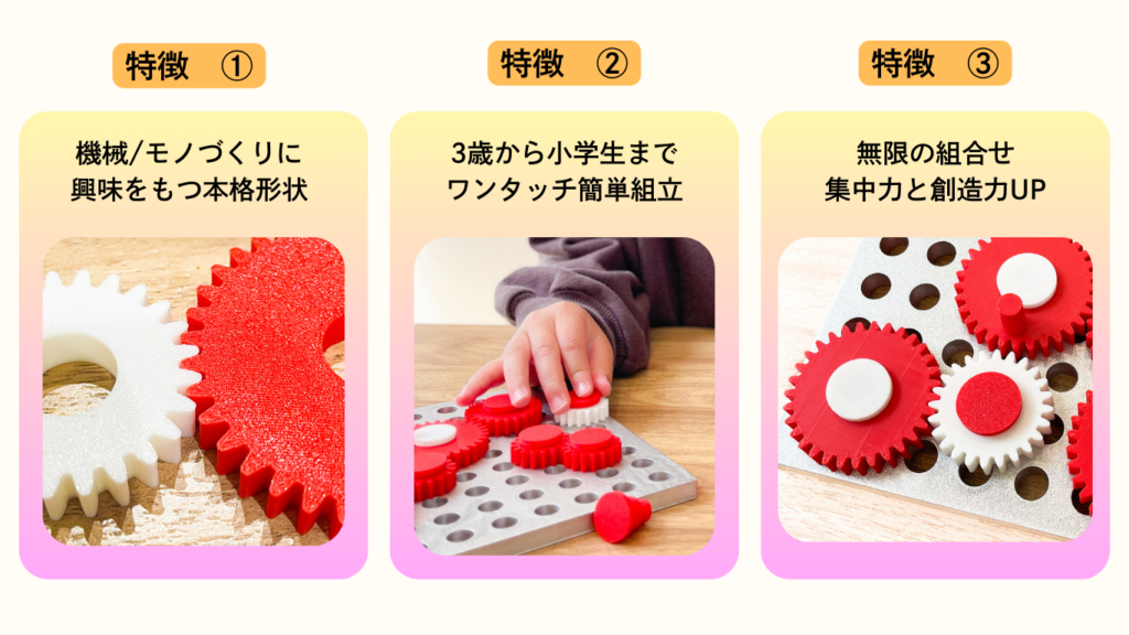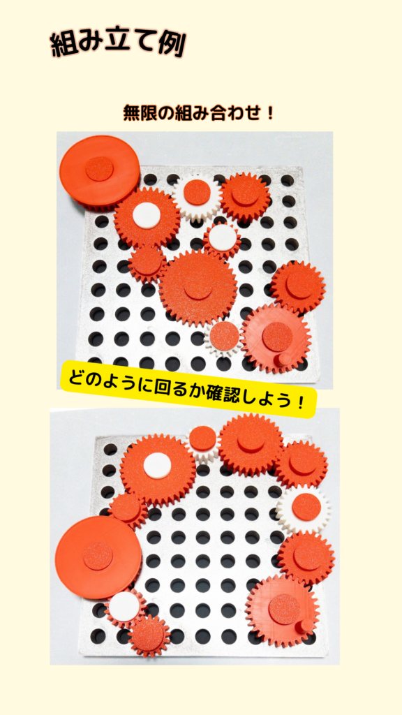無数の穴が空いたプレートに、大小さまざまな歯車を自由に配置!