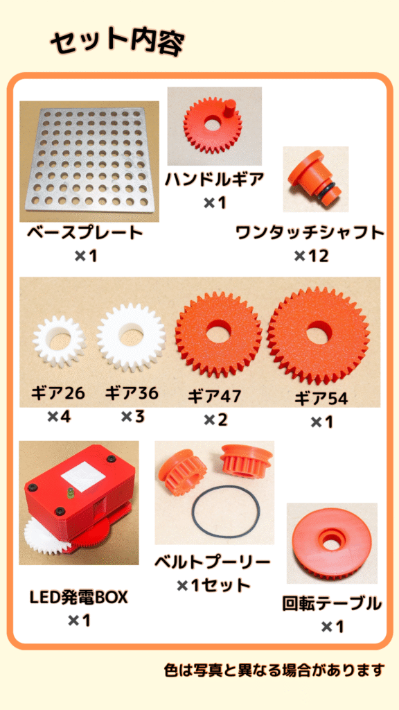 歯車、ベルトプーリー、LED発電機など機械の仕組みに子どもは夢中!